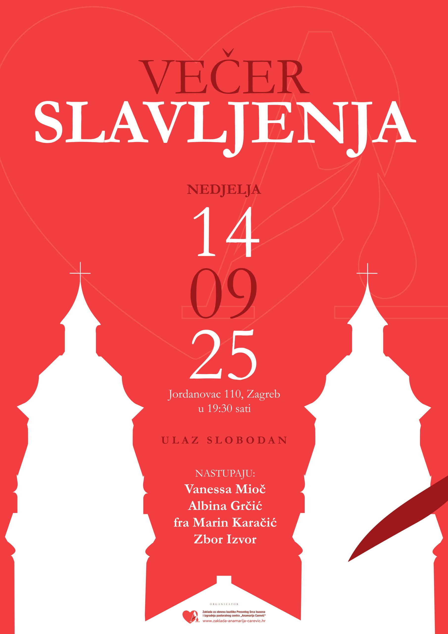 Na dan Uzvišenja sv. Križa, koji ovaj put pada u nedjelju, u sklopu 302. Zavjetnog zagrebačkog hodočašća Majci Božjoj Bistričkoj Zaklada za obnovu bazilike presvetog Srca Isusova i izgradnju pastoralnog centra Anamarija Carević sve vas, dragi prijatelji, molitveni članovi i dobročinitelji poziva na prekrasan molitveni koncert – večer slavljenja u zahvalu za vaše molitve i mar, vaše znanje i svaki dar. U ovoj Svetoj godini, petoj obljetnici potresa, na hodočašću nade, naša bi Anamarija na sv. Lovru, 10. kolovoza, navršila 21 godinu. Sjetimo se njezina rođendana! S radošću vas dočekuju: